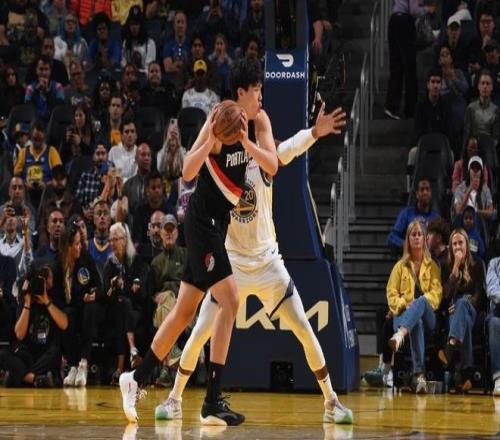 次节比赛中断,开拓者持球进攻。强侧的杨瀚森卡住波斯特,向队友要球。