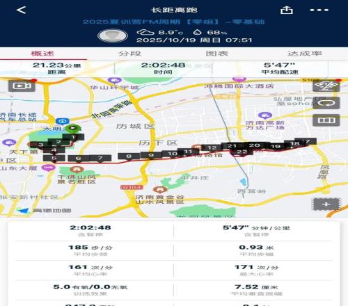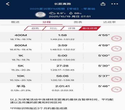 因为我年龄大、体能较差,之前的跑步基础弱(2025年初才首次参加训练营,之前没有任何跑步基础)。跑姿方面:轻微跨步、后腿推蹬、轻微膝内扣,从手表上主要体现在垂直振幅偏高、步频偏低;体能方面:全方位力量弱,很多训练动作完成不了或者做不到位,臀腿力量不足很多动作想做也做不到位,力量不足、本能的身体代偿机制引发轻微膝内扣,核心力量不足导致身体不够挺拔、弯腰或者坐着跑、跑起来框架容易散掉。夏训期间,我本想针对自己的弱项重点改进,虽然跑姿的理论知识都理解,但自己实践起来就是另外一回事。在最初的两个月里,我感觉跑姿改善不大,一直找不到正确的知觉。现在看来改进跑姿是个综合问题,不能为改进跑姿而改进跑姿。只有在力量训练、跑姿训练的积累达到一定程度后,量变才会质变,没有量的积累就没有质的突破。跑步能力的提升没有捷径,科学指导加上训练量的积累缺一不可。直到最后一个月我才稍微有了正确跑姿的知觉,体现在同等6分配速情况下垂直振幅从7.9cm降到7.2cm,垂直振幅比从9%以上降到8.2%左右。之前看训练营每次录的集体跑姿视频我自己都能看出来身体上下起伏、有些跳着跑。