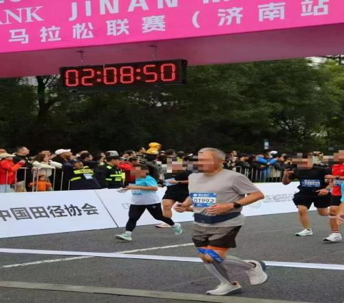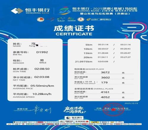 不知道是跑姿吸引,还是步频器的吸引?更或许是一头白发引人关注,七八公里后有个年轻小伙一直跟着我并排跑。他年龄还不到40岁,我鼓励了他几句,并叮嘱他“保持节奏“。10公里后我感觉我一直在超越别人,很少有人从后面超过我,只有在18公里后才觉得开始被人超过。济南赛道难度最大的是17、18公里是接近2公里的大长上坡,很考验体能和意志力,之后折返原路返回、接下来是接近2公里的长下坡。对于膝盖有旧伤的我来说,这段下坡只能收着点跑(感觉就是在这段时间才有不少人超过我)。20公里后又是一个接近1公里的上坡,临近终点才有2百米左右的平缓路面。最后一公里赛道是个上坡,不知道是体能剩余不足,还是感觉今天配速超预期太多,这一公里我没敢全力冲刺,最后一两百米平缓赛道我提前查看手表估算肯定能跑进2:03之内(实际我开表时间是过了起点计时带、稍微滞后10来秒,导致我手表成绩快于实际计时成绩),为了享受最后100米赛道、也为了冲线有个轻松愉悦的表情避免龇牙咧嘴,我留给终点一个美好pose,匀速跑过终点。