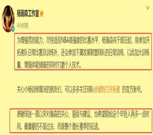 而在仅仅时隔两个小时的三点多,杨瀚森工作室也对杨瀚森下放到发展联赛这件事进行了正面回应。